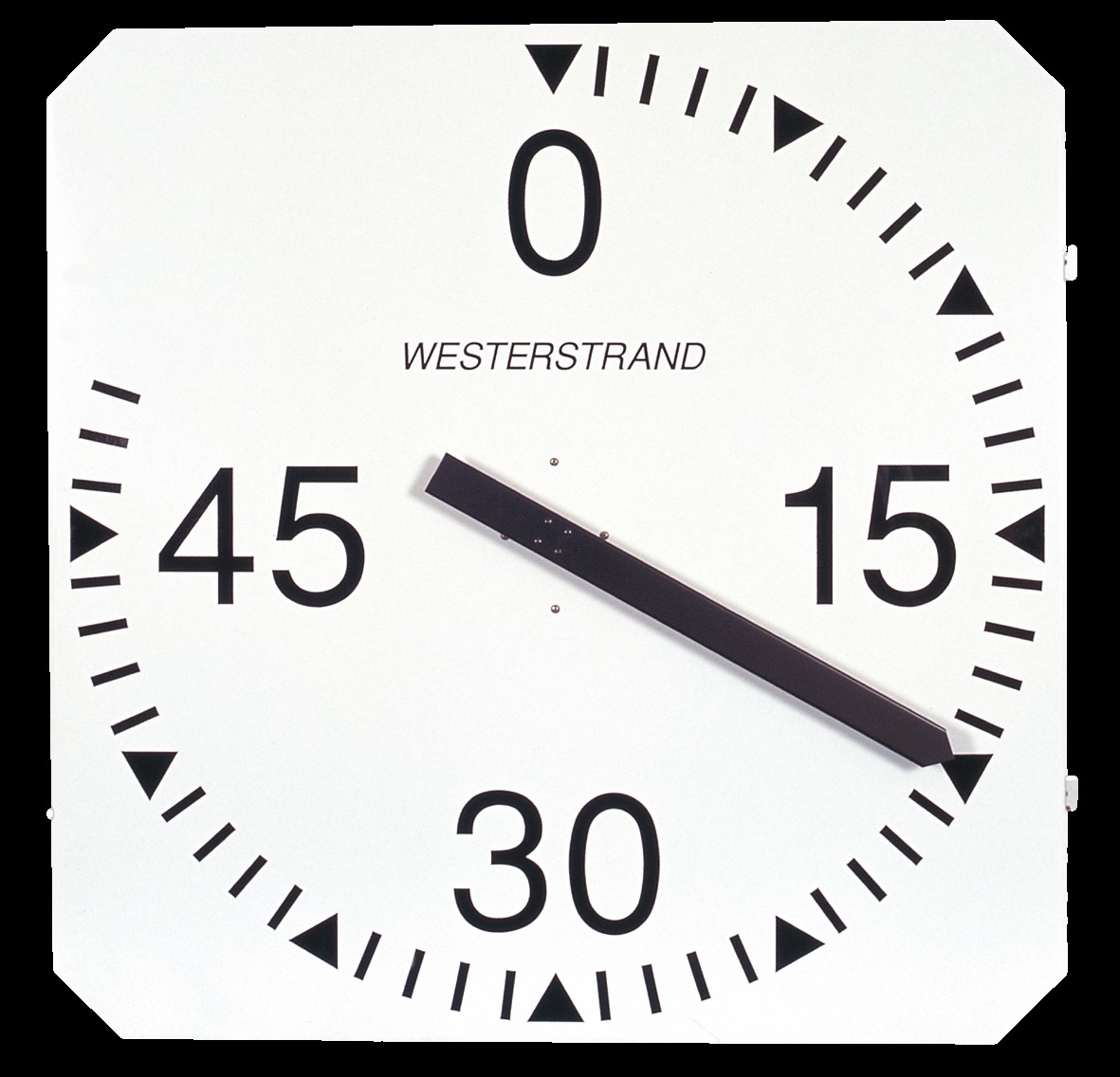 Clock face in white painted aluminum with black numerals and characters. It has a black minute hand also made of aluminum.