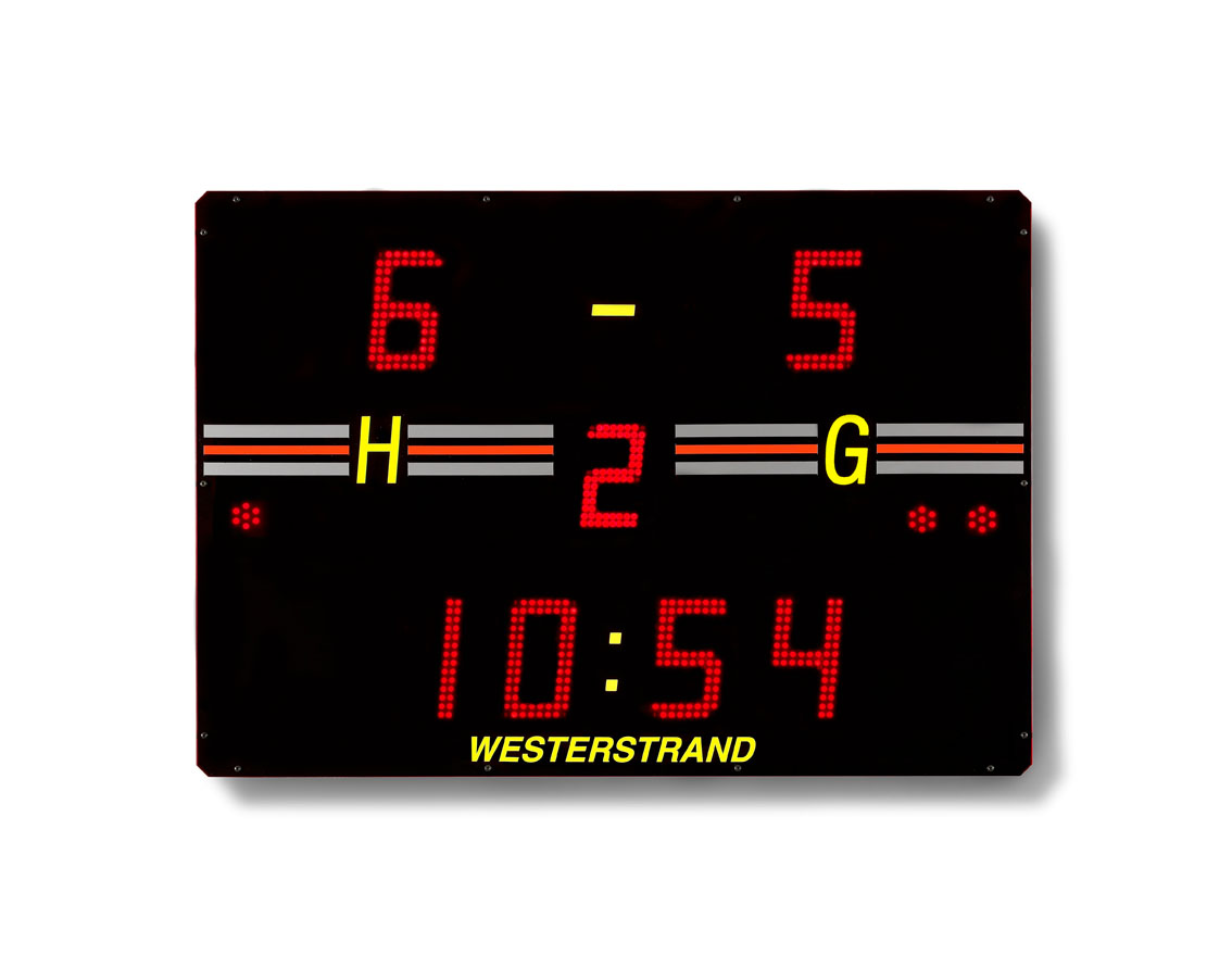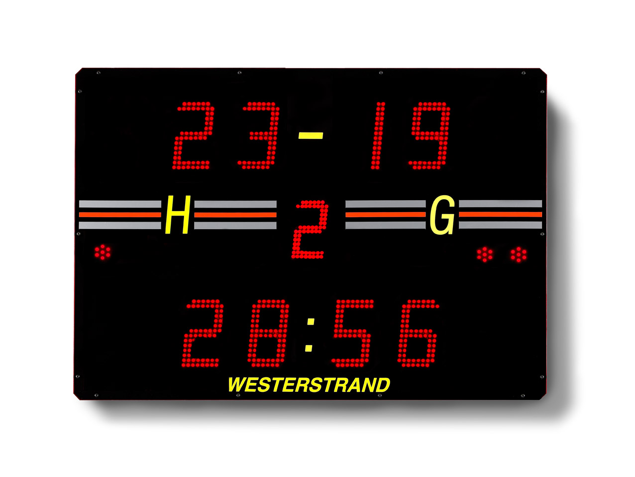 לוח תוצאות עם צופר מובנה וספרות LEDs אדומות בטכנולוגיית SMD. העיצוב הופך אותו למתאים לרוב ענפי הספורט המקורה.