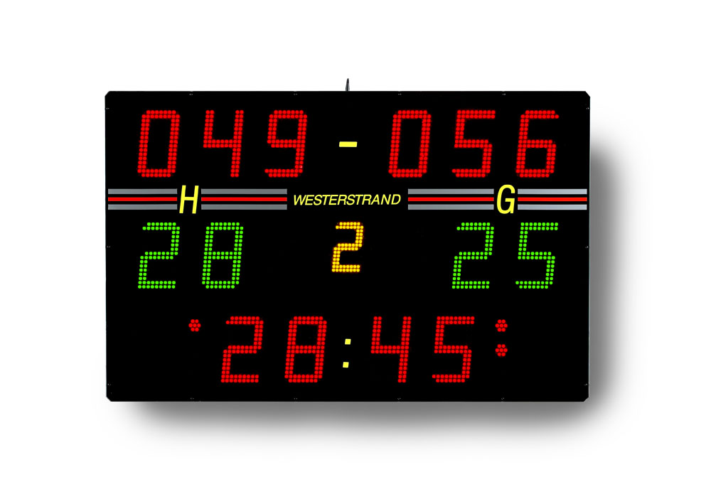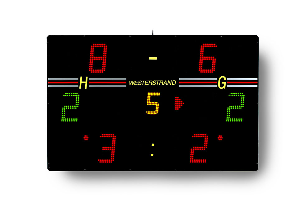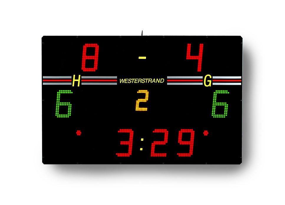 Scoreboard with integrated siren and LED digits in SMD technology. The design makes it suitable for most indoor sports.