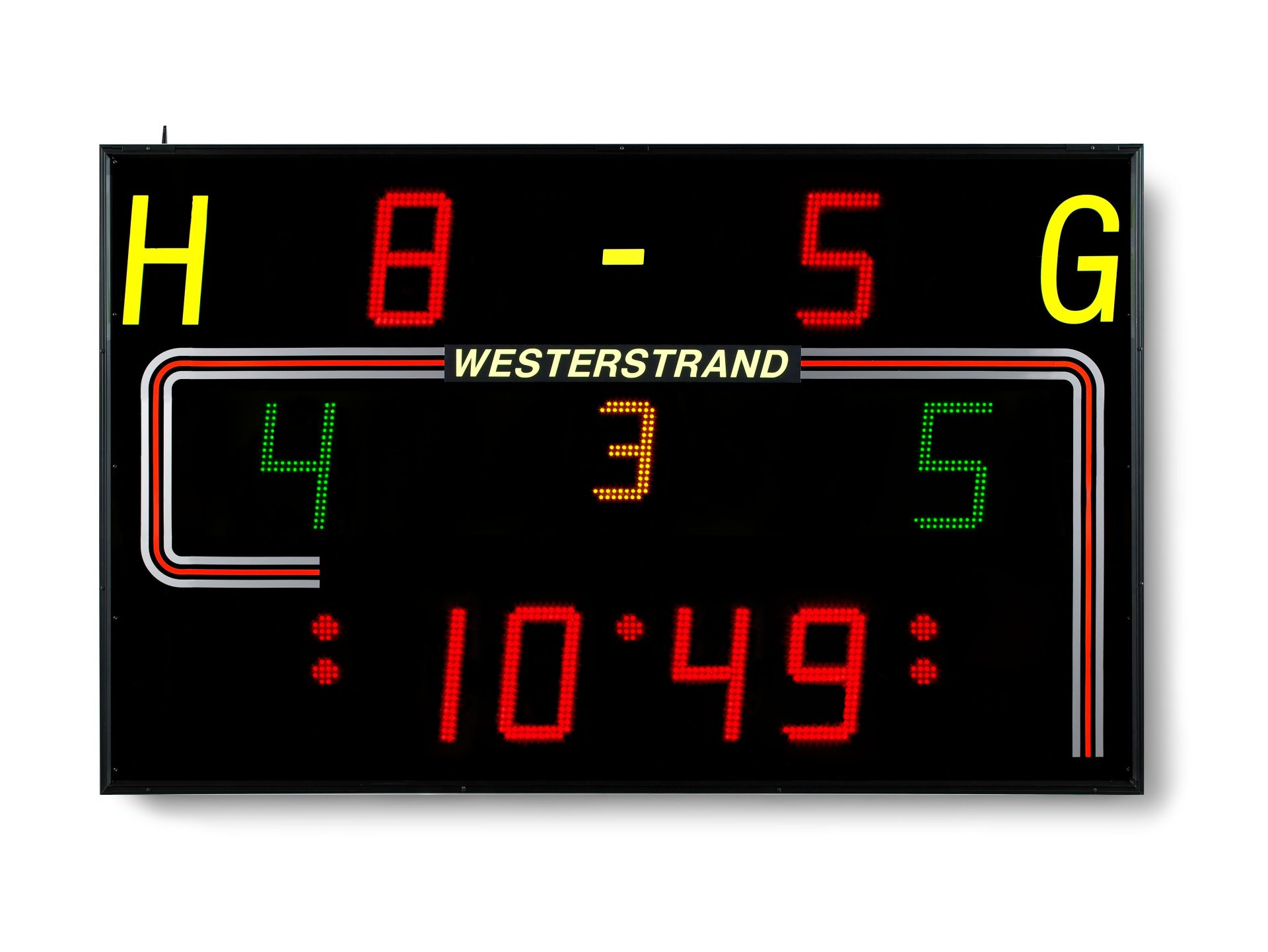 Scoreboard with integrated siren and LED digits in SMD technology.