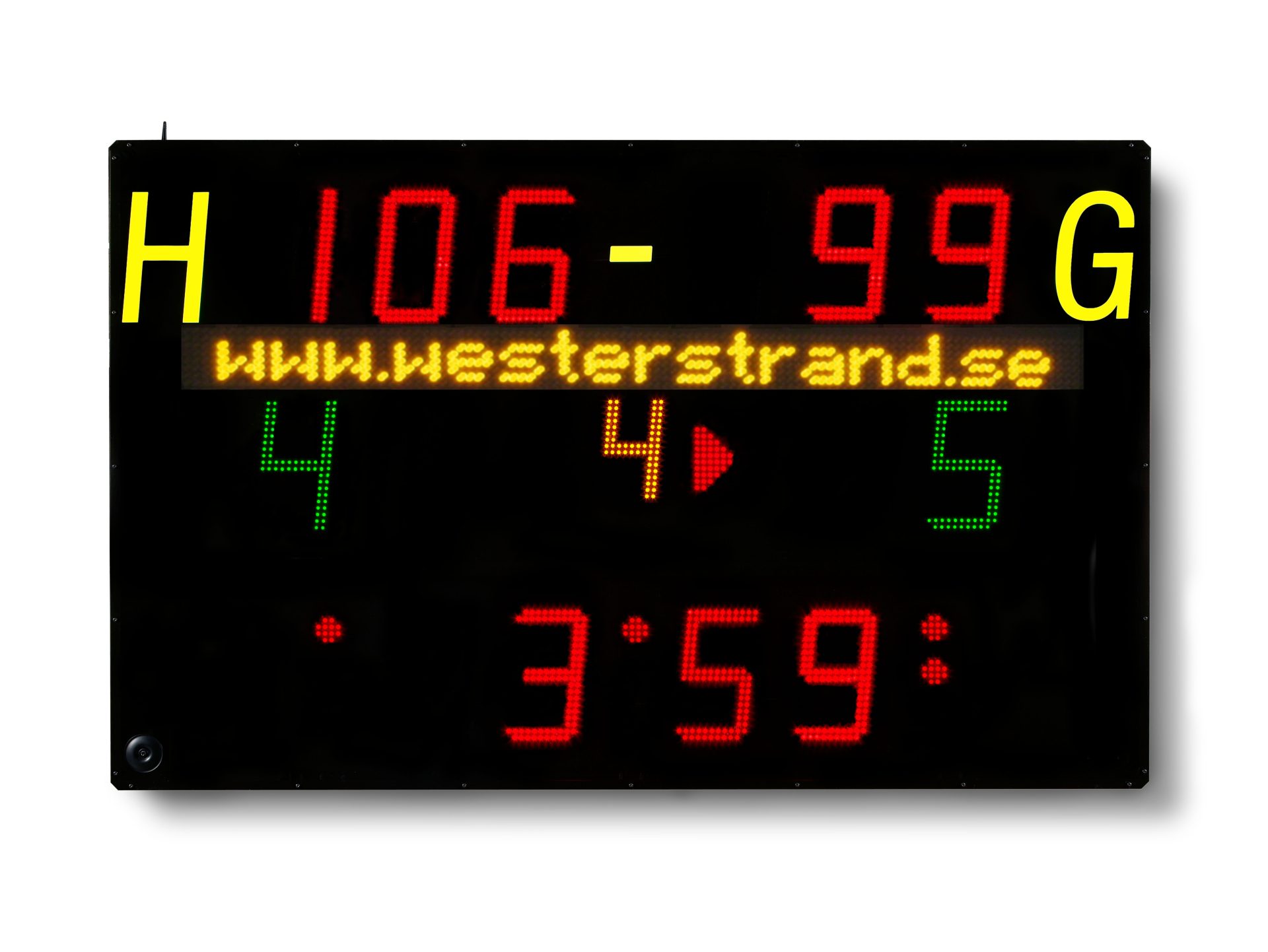 Includes an integrated text matrix line for displaying e.g. team names, alternating information or rolling text. The matrix line is controlled via windows-based software (RS485).