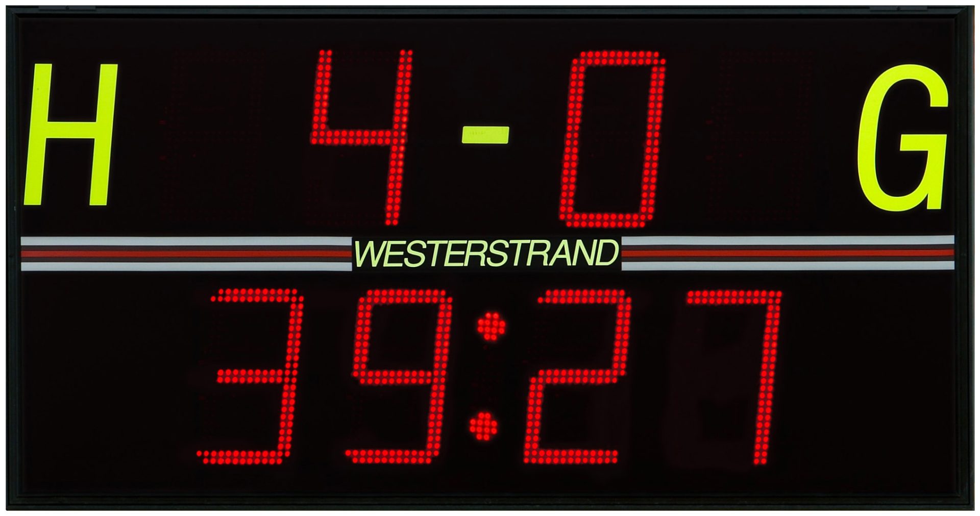 Scoreboard with LED digits in SMD technology. Its design makes it suitable for e.g. soccer and bandy. The board is operated via a wireless remote unit.